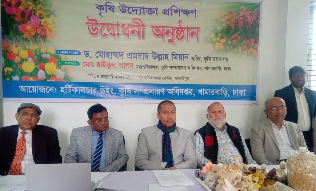 নাহিদ বিন রফিক (বরিশাল): মাদারীপুরে আধুনিক হর্টিকালচার: বর্তমান অবস্থা ও ভবিষ্যৎ কর্মপরিকল্পনা বিষয়ক কর্মশালা অনুষ্ঠিত হয়েছে। রবিবার (০৫ জানুয়ারি) হর্টিকালচার সেন্টারের হলরুমে কৃষি সম্প্রসারণ অধিদপ্তরের (ডিএই) উদ্যোগে এই কর্মশালার আয়োজন করা হয়। অনুষ্ঠানে প্রধান অতিথি ছিলেন কৃষি সচিব ড. মোহাম্মদ এমদাদ উল্লাহ মিয়ান। ডিএইর মহাপরিচালক মো. ছাইফুল আলমের সভাপতিত্বে কর্মশালায় বিশেষ অতিথি ছিলেন কৃষি মন্ত্রণালয়ের সম্প্রসারণ অনুবিভাগের অতিরিক্ত কৃষি সচিব মো. জাকির হোসেন, বাংলাদেশ কৃষি গবেষণা মহাপরিচালক ড. মো. আব্দুল্লাহ ইউছুফ আকন্দ, বিশিষ্ট কৃষিবিজ্ঞানী প্রফেসর ড. এম এ রহিম এবং মাদারিপুরের জেলা প্রশাসক মোছা. ইয়াসমিন আক্তার। অন্যান্যের মধ্যে বক্তব্য রাখেন হর্টিকালচার উইংয়ের অতিরিক্ত পরিচালক কেজেএম আব্দুল আউয়াল, বছরব্যাপী ফল উৎপাদনের…