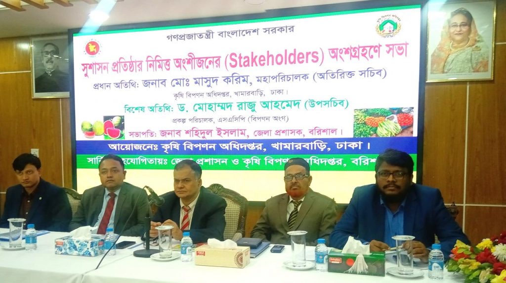 নাহিদ বিন রফিক (বরিশাল): বরিশালে সুশাসন প্রতিষ্ঠার নিমিত্তে অংশীজনের অংশগ্রহণ সভা অনুষ্ঠিত হয়েছে। রবিবার (৪ ফেব্রুয়ারি) নগরীর সার্কিট হাউজ সম্মেলনকক্ষে কৃষি বিপণন অধিদপ্তরের উদ্যোগে এই অনুষ্ঠানের আয়োজন করা হয়। অনুষ্ঠানে প্রধান অতিথি ছিলেন কৃষি বিপণন অধিদপ্তরের মহাপরিচালক (অতিরিক্ত সচিব) মো. মাসুদ করিম। বিশেষ অতিথি ছিলেন কৃষি সম্প্রসারণ অধিদপ্তরের অতিরিক্ত পরিচালক মো. শওকত ওসমান এবং স্মল হোল্ডার এগ্রিকালচারাল কম্পিটিটিভনেস প্রজেক্টের প্রকল্প পরিচালক (বিপণন অংগ) ড. মোহাম্মদ রাজু আহমেদ (উপসচিব)। অনুষ্ঠানে সভাপতিত্ব করেন অতিরিক্ত জেলা প্রশাসক (সার্বিক) মনদীপ ঘরাই। কৃষি বিপণন অধিদপ্তরের সহকারি পরিচালক কিশোর কুমার সাহার সঞ্চালনায় অন্যান্যের মধ্যে বক্তব্য রাখেন বীজ প্রত্যয়ন এজেন্সির সহকারী আঞ্চলিক বীজ প্রত্যয়ন অফিসার মো. জাকির…