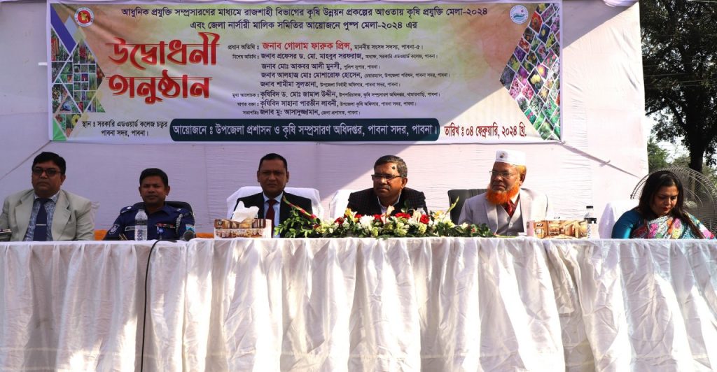 মো. গোলাম আরিফ (পাবনা) : আধুনিক প্রযুক্তি সম্প্রসারণের মাধ্যমে রাজশাহী বিভাগের কৃষি উন্নয়ন প্রকল্পের আওতায় ০৩ দিনব্যাপী কৃষি প্রযুক্তি মেলা ও জেলা নার্সারী মালিক সমিতির আয়োজনে ২১ দিনব্যাপী পুষ্প মেলা ২০২৪ এর উদ্বোধন হয়েছে। রবিবার (৪ ফেব্রুয়ারি) বেলা ৩ টায় পাবনা সরকারি এডওয়ার্ড কলেজের কামাল উদ্দিন মাঠ প্রাঙ্গণে এ অনুষ্ঠানের আয়োজন করা হয়। এ সময় প্রধান অতিথি হিসেবে উপস্থিত ছিলেন পাবনা-৫ আসনের সংসদ সদস্য, গোলাম ফারুক প্রিন্স। প্রধান অতিথি বলেন, প্রধানমন্ত্রী বলেছিলেন দেশে আগামীতে খাদ্য ঘাটতি দেখা দিতে পারে এজন্য প্রতি ইঞ্চি জমির পরিকল্পিত ব্যবহার করতে হবে। প্রধানমন্ত্রীর নিদের্শনা বাস্তবায়নে কৃষি বিভাগসহ সংশ্লিষ্ট সকলে কাজ করে যাচ্ছি বলেই মানুষের খাদ্য…