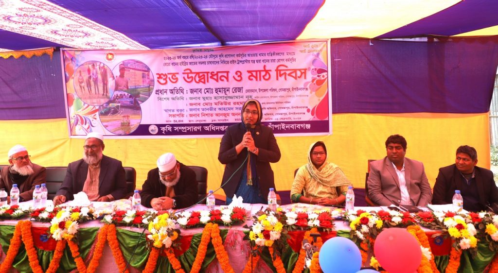 মো. আমিনুল ইসলাম (রাজশাহী) : চাঁপাইনবাবগঞ্জ গোমস্তাপুর উপজেলা কৃষি সম্প্রসারণ অধিদপ্তরের আয়োজনে গত ০১ ফেব্রুয়ারি (বৃহস্পতিবার) ২০২৩-২৪ অর্থবছরে রবি মৌসুমে কৃষি প্রণোদনা কর্মসূচির আওতায় খামার যান্ত্রিকীকরণের মাধ্যমে ৫০ একর জমিতে হাইব্রিড জাতের বোরোধানের সমলয়ে চাষাবাদের লক্ষ্যে লেবুডাঙ্গায় ট্রেতে উৎপাদিত ধানের চারা রাইস ট্রান্সপ্লান্টার যন্ত্রের সাহায্যে রোপণের শুভ উদ্বোধন ও মাঠ দিবস অনুষ্ঠিত হয়। উপজেলা নির্বাহী অফিসার নিশাত আনজুম অনন্যার সভাপতিত্বে অনুষ্ঠানে প্রধান অতিথি হিসেবে উপস্থিত ছিলেন চাঁপাইনবাবগঞ্জ গোমস্তাপুর উপজেলা পরিষদের চেয়ারম্যান মো: হুমায়ুন রেজা । বিশেষ অতিথি হিসেবে উপস্থিত ছিলেন সহকারী কমিশনার (ভূমি) জান্নাতুল ফেরদৌস,উপজেলা ভাইস চেয়ারম্যান হাসানুজ্জামান নূহ, কৃষি যান্ত্রিকীকরণ প্রকল্পের মনিটরিং অফিসার জনাব শাহ সাইদুর রহমান এবং রাধানগর…