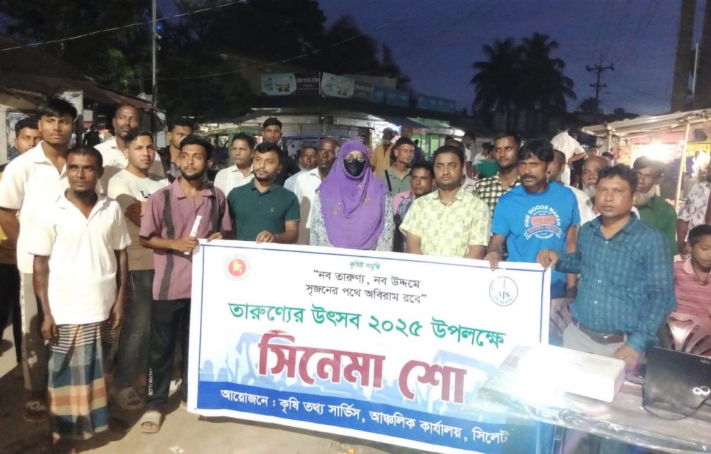 জুলফিকার আলী (সিলেট) : কৃষি তথ্য সার্ভিস, আঞ্চলিক কার্যালয়, সিলেট এর আয়োজনে উপজেলা কৃষি অফিস, কোম্পনীগঞ্জ এর সহযোগিতায় “তারুণ্যের উৎসব-২০২৫” উপলক্ষ্যে সিলেট জেলার কোম্পনীগঞ্জ উপজলার ইসলামপুর পশ্চিম ইউনিয়নের পাড়ুয়া বাজারে সন্ধ্যাকালীন কৃষি বিষয়ক “সিনেমা শো” আজ সোমবার (২২. সেপ্টেম্বর) প্রদর্শন করা হয়।করা হয়।