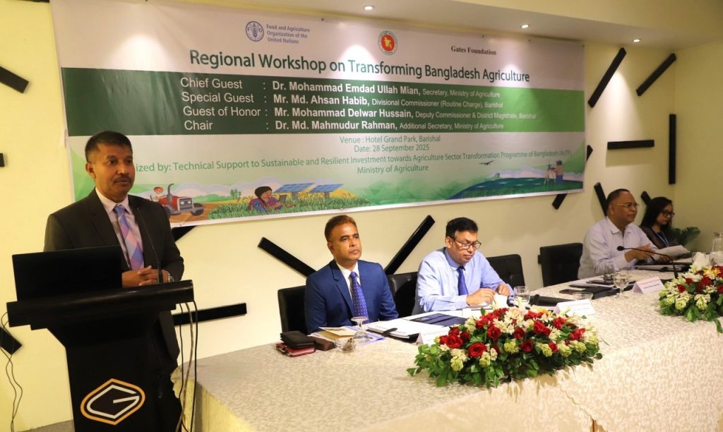 নাহিদ বিন রফিক (বরিশাল): বাংলাদেশের কৃষি রুপান্তর ২০৫০ বিষয়ক কর্মশালা বরিশালে অনুষ্ঠিত হয়েছে। আজ নগরীর বান্দ রোডে অবস্থিত হোটেল গ্রান্ড পার্কের হলরুমে কৃষি মন্ত্রণালয়ের উদ্যোগে এই কর্মশালার আয়োজন করা হয়। অনুষ্ঠানে প্রধান অতিথি ছিলেন কৃষি সচিব ড. মোহাম্মদ এমদাদ উল্লাহ মিয়ান। কৃষি মন্ত্রণালয়ের অতিরিক্ত সচিব ড. মো. মাহমুদুর রহমানের সভাপতিত্বে অনুষ্ঠানে বিশেষ অতিথি ছিলেন বরিশালের বিভাগীয় কমিশনার (রুটিন দায়িত্ব) মো. আহসান হাবীব। গেস্ট অব অনার হিসেবে ছিলেন বরিশালের জেলা প্রশাসক মোহাম্মদ দেলোয়ার হোসেন।