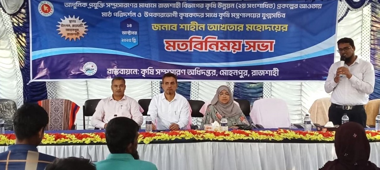 রাজশাহী সংবাদদাতা: আধুনিক প্রযুক্তি সম্প্রসারণের মাধ্যমে রাজশাহী বিভাগের কৃষি উন্নয়ন (২য় সংশোধিত) প্রকল্পের আওতায় এবং কৃষি সম্প্রসারণ অধিদপ্তর, মোহনপুর, রাজশাহী কর্তৃক বাস্তবায়িত নিরাপদ উচ্চমূল্য ফসল মঙ্গলবার (১৪ অক্টোবর) উপজেলার টাংগন, রায়ঘাটিতে মাঠ পরিদর্শন ও উপকারভোগী কৃষকদের সাথে মতবিনিময় করেন কৃষি মন্ত্রণালয়ের যুগ্মসচিব শাহীন আখতার । উক্ত প্রোগ্রামে আরো উপস্থিত ছিলেন কৃষি উন্নয়ন (২য় সংশোধিত) প্রকল্পের পরিচালক হাসানুজ্জামান, উপ প্রকল্প পরিচালক মো. আমিনুজ্জামান, কৃষি সম্প্রসারণ অধিদপ্তর, রাজশাহীর অতিরিক্ত উপপরিচালক (পিপি) ড. মো. আব্দুল মজিদ, উপজেলার কৃষি সম্প্রসারণ অফিসার মোহা. আব্দুল মতিন, মনিটরিং অফিসার নাঈম হাসান, উদ্ভিদ সংরক্ষণ কর্মকর্তা ও সংশ্লিষ্ট ব্লকের উপসহকারী কৃষি কর্মকর্তাগণ।