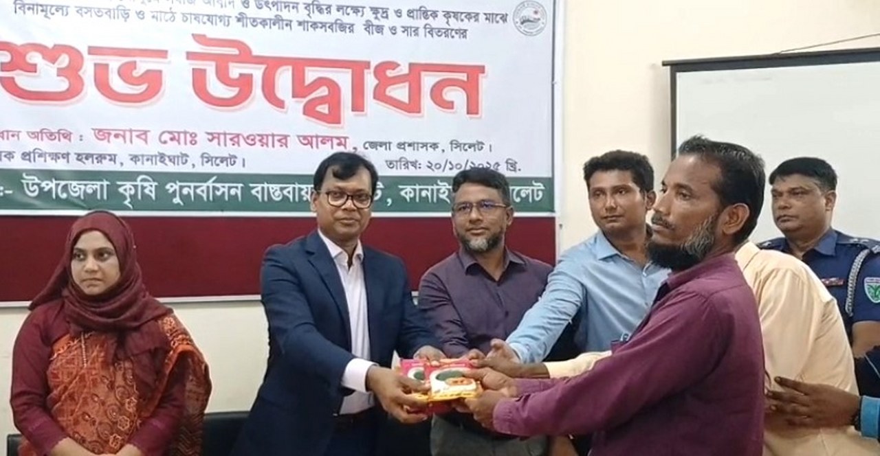 সিলেট সংবাদদাতা: সোমবার (২০ অক্টোবর) সিলেটের কানাইঘাটে ২০২৫-২৬ অর্থবছরে রবি মৌসুমে সবজি আবাদ ও উৎপাদন বৃদ্ধির লক্ষ্যে ক্ষুদ্র ও প্রান্তিক কৃষকের মাঝে বিনামূল্যে বসতবাড়ি ও মাঠে চাষযোগ্য শীতকালীন শাক সবজির বীজ ও সার বিতরণের শুভ উদ্বোধন করা হয়।