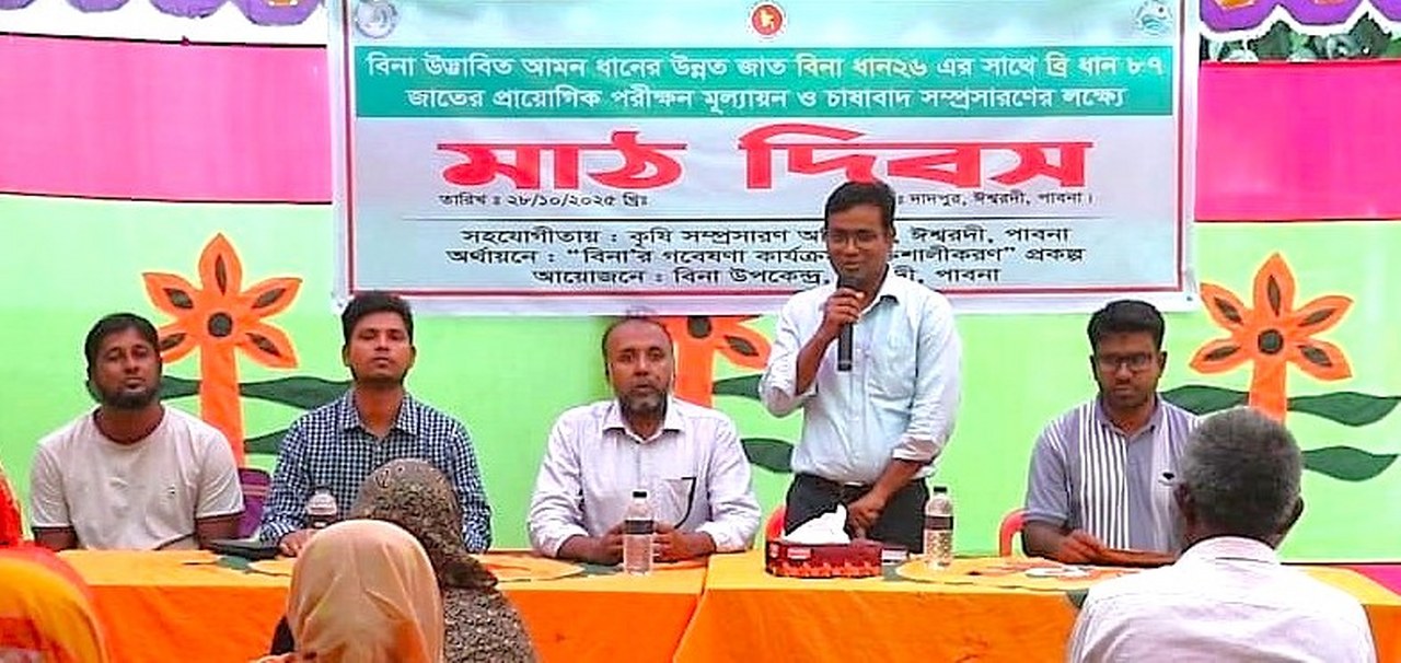 পাবনা সংবাদদাতা: পাবনা’র ঈশ্বরদী উপজেলার দাঁদপুর গ্রামে মঙ্গলবার (২৮ অক্টোবর) বিনা উদ্ভাবিত আমন ধানের উন্নত জাত বিনা ধান২৬ এর সাথে ব্রি ধান৮৭ এর প্রায়োগিক পরীক্ষণ মূল্যায়ন ও চাষাবাদ সম্প্রসারণের লক্ষ্যে মাঠ দিবস অনুষ্ঠিত হয়েছে। বাংলাদেশ পরমাণু কৃষি গবেষণা ইনস্টিটিউট (বিনা) উপকেন্দ্র ঈশ্বরদী এই মাঠ দিবস এর আয়োজন করেন। অনুষ্ঠানে প্রধান অতিথি হিসেবে উপস্থিত ছিলেন কৃষিবিদ মো. জাহাঙ্গীর আলম প্রামানিক, উপপরিচালক, কৃষি সম্প্রসারণ অধিদপ্তর, পাবনা। বিনা উপকেন্দ্র ঈশ্বরদীর পিএসও এবং ভারপ্রাপ্ত কর্মকর্তা ফেরদৌস ইকবাল এতে সভাপতিত্ব করেন। বিশেষ অতিথি ছিলেন কৃষিবিদ মো. আব্দুল মমিন, উপজেলা কৃষি অফিসার, ঈশ্বরদী। এছাড়াও বৈজ্ঞানিক কর্মকর্তা মাহবুবুল আলমসহ অন্যান্য কর্মকর্তা-কর্মচারী এবং দাদপুর গ্রামের কৃষক কৃষাণীবৃন্দ এসময় উপস্থিত ছিলেন।