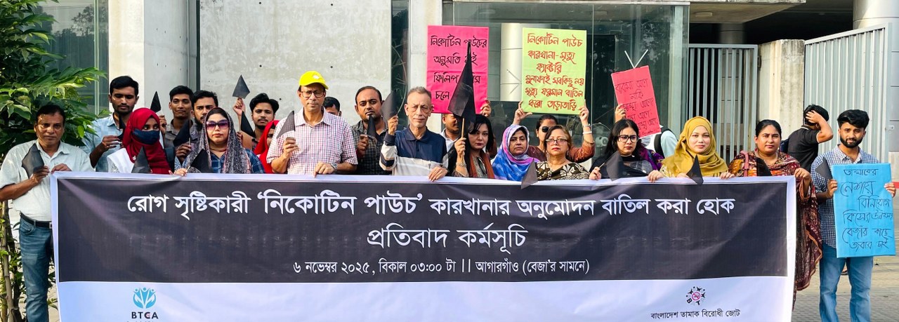 বৃহস্পতিবার (০৬ নভেম্বর) বিকাল সাড়ে ৩ টায় রাজধানীর আগারগাঁওয়ে বেজা’র সামনে প্রধান সড়কে বাংলাদেশ তামাক বিরোধী জোট ও বাংলাদেশ টোব্যাকো কন্ট্রোল এডভোকেটের যৌথ আয়োজনে “রোগ সৃষ্টিকারী ‘নিকোটিন পাউচ’ কারখানার অনুমোদন বাতিল করা হোক” শীর্ষক একটি প্রতিবাদ কর্মসূচি বক্তারা এসব কথা বলেন।