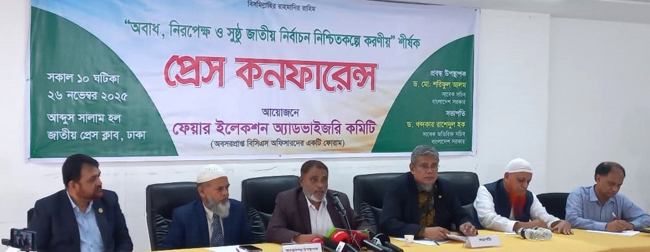 নিজস্ব প্রতিবেদক: বুধবার (২৬ নভেম্বর) আসন্ন ত্রয়োদশ জাতীয় সংসদ নির্বাচন অবাধ, নিরপেক্ষ ও সুস্ঠু জাতীয় নির্বাচন আয়োজনে নির্বাচন কমিশন ও সংশ্লিষ্টদের সর্বোচ্চ পেশাদারিত্ব ও নৈতিকতা প্রদর্শনের আহ্বান জানিয়েছে ফেয়ার ইলেকশন অ্যাডভাইজরি কমিটি। আজ (২৬ নভেম্বর) সকাল ১০ টায় জাতীয় প্রেসক্লাবের আব্দুস সালাম হলে এক সাংবাদিক সম্মেলনে এই আহ্বান জানান তারা।