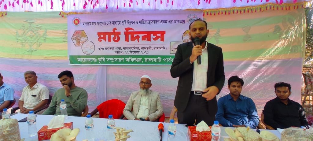উপজেলার ধলিয়া ব্লকে উপসহকারী কৃষি কর্মকর্তা শেখর চৌধুরীর তত্ত্বাবধানে উদ্যোক্তা সাজু তঞ্চঙ্গ্যার স্পন ও মাশরুম উৎপাদন খামার প্রাঙ্গণে এ মাঠ দিবস অনুষ্ঠিত হয়। এতে ৩০ জন মাশরুম চাষি দলসহ দুই শতাধিক কৃষক-কৃষাণী, স্থানীয় হেডম্যান-কারবারী ও গ্রামবাসী অংশগ্রহণ করেন।