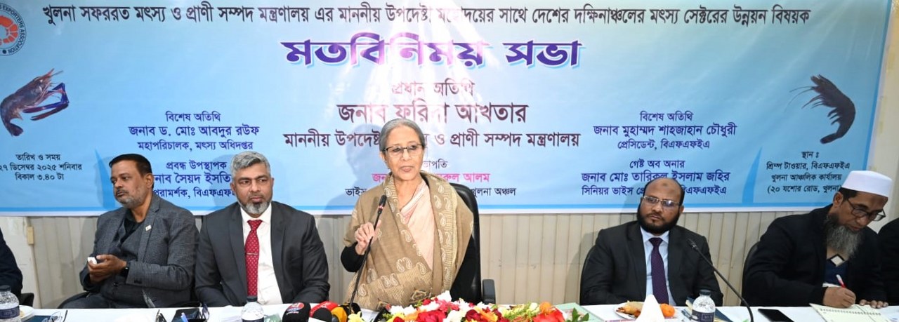 শনিবার (২৭ ডিসেম্বর) সন্ধ্যায় খুলনার শ্রিম্প টাওয়ারে বাংলাদেশ হিমায়িত খাদ্য রপ্তানিকারক অ্যাসোসিয়েশন (বিএফএফইএ) আয়োজিত দক্ষিণাঞ্চলের মৎস্য সেক্টরের উন্নয়ন বিষয়ক মতবিনিময় সভায় প্রধান অতিথির বক্তব্যে এসব কথা বলেন তিনি।