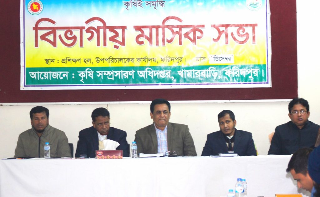 আসাদুল্লাহ (ফরিদপুর): কৃষি সম্প্রসারণ অধিদপ্তর (ডিএই), ফরিদপুর জেলার বিভাগীয় মাসিক সভা আজ সোমবার (৫ জানুয়ারি) নগরীর খামারবাড়িতে অনুষ্ঠিত হয়েছে। কৃষি সম্প্রসারণ অধিদপ্তর, ফরিদপুরের উদ্যোগে আয়োজিত এ সভায় সভাপতিত্ব করেন জেলা উপপরিচালক কৃষিবিদ মো. শাহাদুজ্জামান।