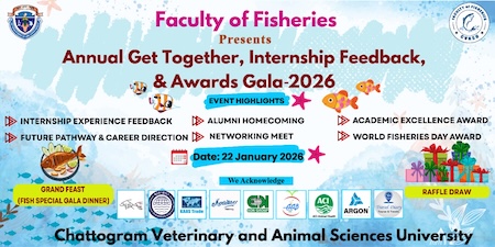 সিভাসু সংবাদদাতা: চট্টগ্রাম ভেটেরিনারি ও এনিম্যাল সাইন্সেস বিশ্ববিদ্যালয় (সিভাসু) এর মাৎস্যবিজ্ঞান অনুষদের উদ্যোগে আগামী বৃহস্পতিবার (২২ জানুয়ারি) বিশ্ববিদ্যালয় ক্যাম্পাস প্রাঙ্গণে প্রথমবারের মতো অনুষ্ঠিত হতে যাচ্ছে “Annual Get-Together, Internship Feedback and Award Gala-2026”। দিনব্যাপী এই আয়োজনের মাধ্যমে শিক্ষার্থী, অ্যালামনাই, শিক্ষক এবং দেশের মৎস্যখাত সংশ্লিষ্ট বিভিন্ন অংশীজনদের মধ্যে কার্যকর সংযোগ ও অভিজ্ঞতা বিনিময়ের সুযোগ সৃষ্টি করা হবে।