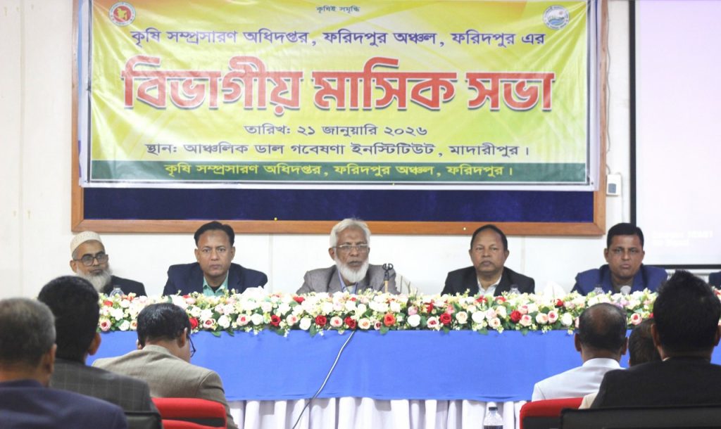 আসাদুল্লাহ (ফরিদপুর) : কৃষি উৎপাদন বৃদ্ধি ও প্রযুক্তি সম্প্রসারণ কার্যক্রমকে আরও গতিশীল করার লক্ষ্যে কৃষি সম্প্রসারণ অধিদপ্তরের আঞ্চলিক সভা অনুষ্ঠিত হয়েছে। বুধবার (২১ জানুয়ারি) মাদারীপুরের আঞ্চলিক ডাল গবেষণা ইনস্টিটিউটের হলরুমে কৃষি সম্প্রসারণ অধিদপ্তর, ফরিদপুর অঞ্চল, ফরিদপুর-এর উদ্যোগে এ সভার আয়োজন করা হয়।