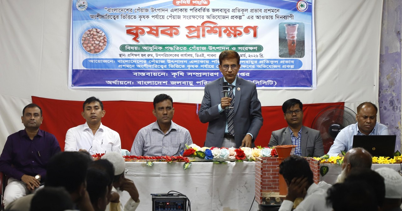 পাবনা সংবাদদাতা: “বাংলাদেশের পেঁয়াজ উৎপাদন এলাকায় পরিবর্তিত জলবায়ুর প্রতিকূল প্রভাব প্রশমনে অংশীদারিত্বের ভিত্তিতে কৃষক পর্যায়ে পেঁয়াজ সংরক্ষণের অভিযোজন প্রকল্প” এর আওতায় দিনব্যাপী কৃষক প্রশিক্ষণ অনুষ্ঠিত হয়েছে। রবিবার (০১ মার্চ) সকাল ১০ টায় উপপরিচালকের কার্যালয়, পাবনা খামারবাড়িস্থ প্রশিক্ষণ হলে এ প্রশিক্ষণের আয়োজন করা হয়। এ সময় প্রধান অতিথি ছিলেন কৃষিবিদ মো. আব্দুল ওয়াদুদ, অতিরিক্ত পরিচালক, কৃষি সম্প্রসারণ অধিদপ্তর, বগুড়া অঞ্চল।