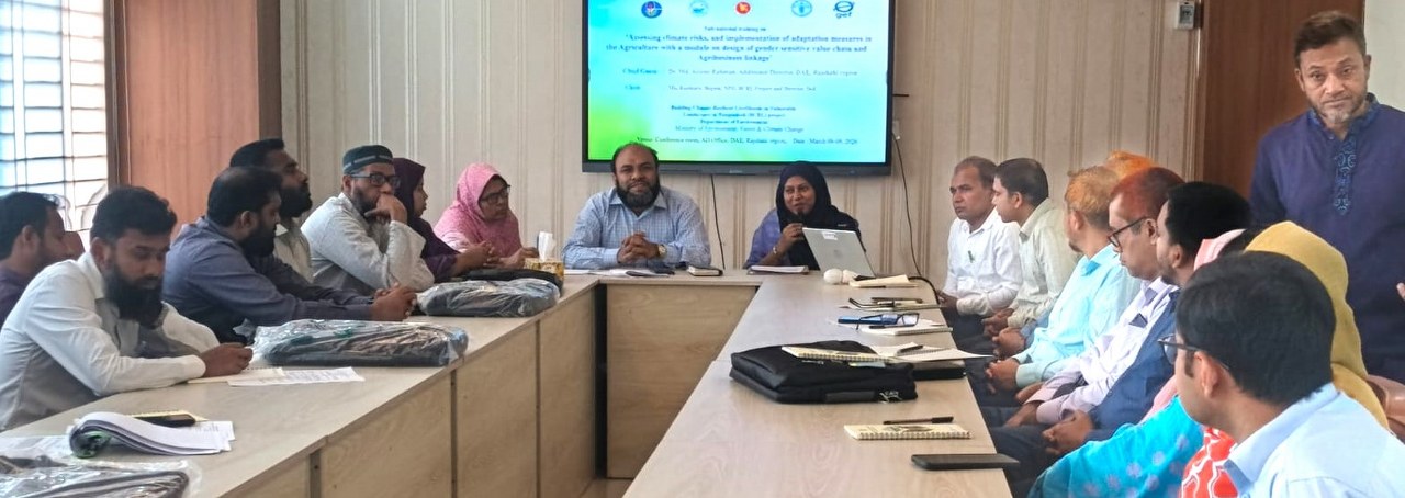 রাজশাহী সংবাদদাতা: জলবায়ু পরিবর্তনের ফলে ‘’Assrssing climate Risks and Implementation of Adaptation Measures in the Agricalture with a Module on design of Gender Sensitive Value Chain and Agribusiness Linkage” শীর্ষক দুই দিন ব্যাপি প্রশিক্ষণ (০৮-০৯ মার্চ) কৃষি সম্প্রসারণ অধিদপ্তরের সহায়তায় এবং Bullding Climate Resilient Livelihoods in Vulnerable Landscapes in Bangladesh project in Department of Environment এর আওতায় অতিরিক্ত পরিচালক রাজশাহী অঞ্চল এর হলরুমে অনুষ্ঠিত হয়।