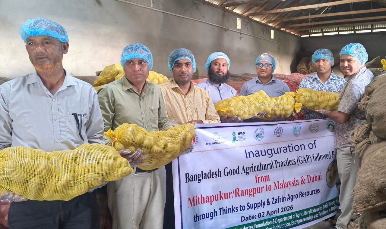 রংপুর সংবাদদাতা : রংপুরের মিঠাপুকুর উপজেলা থেকে মালয়েশিয়া ও দুবাইয়ে ‘সানশাইন’ জাতের আলু রপ্তানি শুরু হয়েছে। বাংলাদেশ উত্তম কৃষি চর্চা (GAP) মানদণ্ড অনুসরণ করে উৎপাদিত এ আলু থিংকস টু সাপ্লাই ও জাফরিন এগ্রো রিসোর্স লিমিটেডের মাধ্যমে আন্তর্জাতিক বাজারে পাঠানো হচ্ছে।