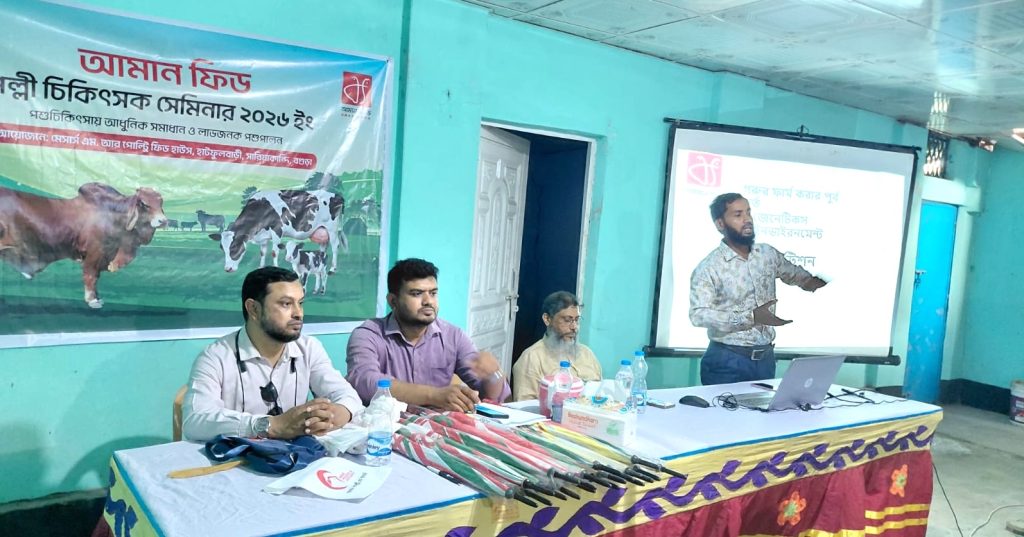 বগুড়া সংবাদদাতা: দেশের শীর্ষস্থানীয় পোল্ট্রি, ফিশ ও ক্যাটল ফিড উৎপাদনকারী প্রতিষ্ঠান আমান ফিড পিএলসি’র উদ্যোগে এক ব্যতিক্রমধর্মী ‘পল্লী চিকিৎসক সেমিনার’ অনুষ্ঠিত হয়েছে। গবাদিপশুর স্বাস্থ্য সুরক্ষা এবং আধুনিক পুষ্টি ব্যবস্থাপনা সম্পর্কে প্রান্তিক খামারি ও পল্লী চিকিৎসকদের সচেতনতা বৃদ্ধির লক্ষ্যেই এ আয়োজন করা হয়।
