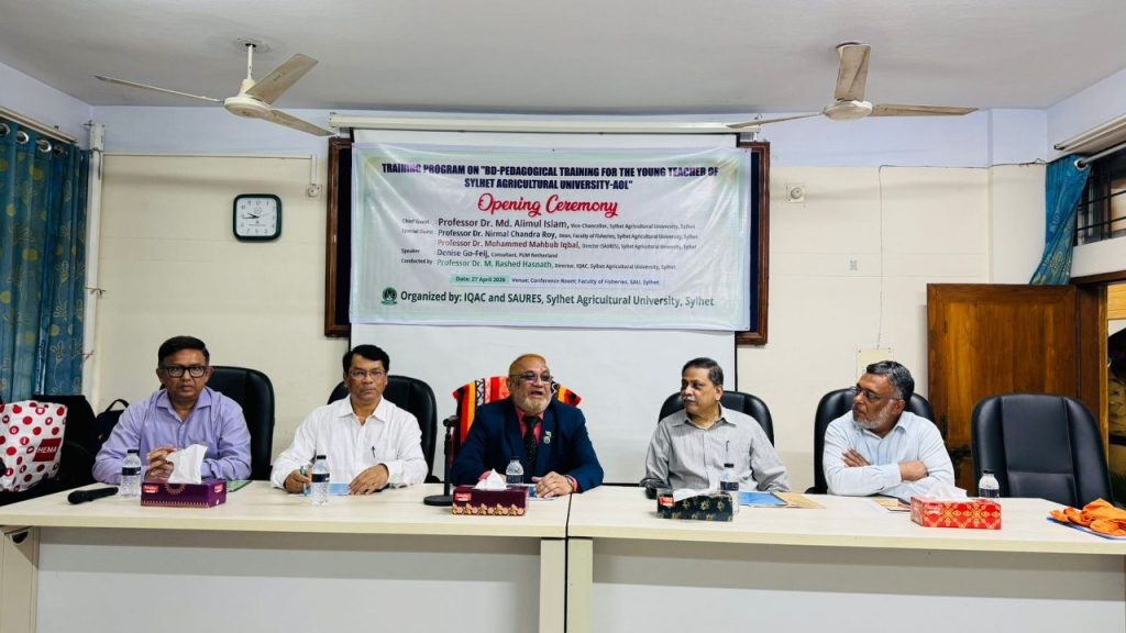 সিকৃবি সংবাদদাতা: সিলেট কৃষি বিশ্ববিদ্যালয়ের (সিকৃবি) ইনস্টিটিউশনাল কোয়ালিটি অ্যাস্যুরেন্স সেল (আইকিউএসি) ও সিকৃবি রিসার্চ সিস্টেম (সাউরেস) এর যৌথ উদ্যোগে মাৎস্যবিজ্ঞান অনুষদের কনফারেন্স রুমে সিকৃবি শিক্ষকদের চার দিন ব্যাপি ‘বিডি-পেডাগোজিক্যাল ট্রেনিং ফর দ্যা ইয়াং টিচার অব সিলেট এগ্রিকালচারাল ইউনিভার্সিটি-এওএল’ বিষয়ক প্রশিক্ষণ শুরু হয়েছে।